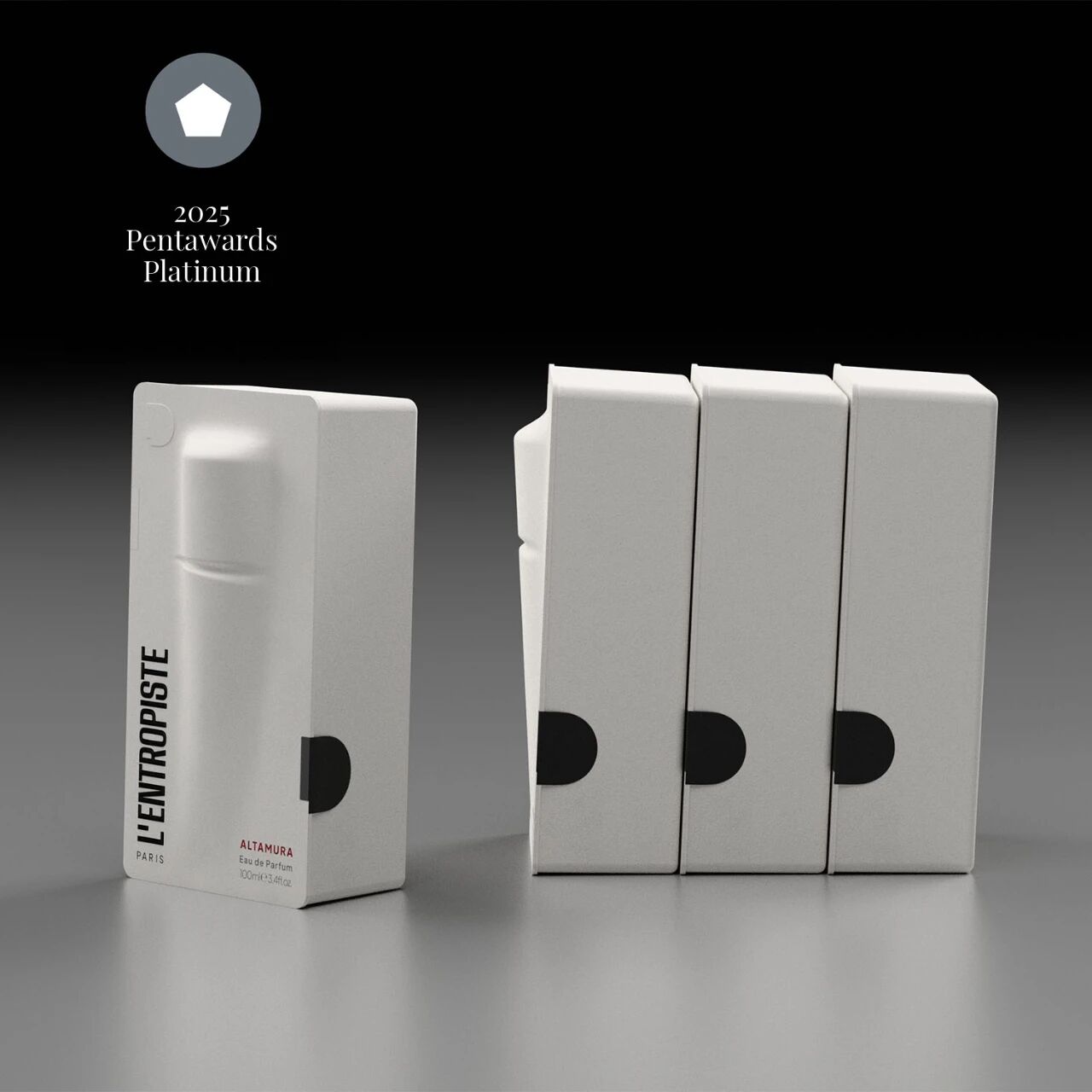 L'ENTROPISTE – Master of Disorder(法国Centdegres出品)——香水包装长期遵循着精致、对称和优雅的准则,采用了创新的纸塑工艺。与传统包装不同,纸塑不仅能实现复杂的立体造型,赋予香水瓶如艺术品般的“定制肌肤”,更以其可回收、可降解的环保特性,完美契合了当代奢侈品对可持续发展的追求。